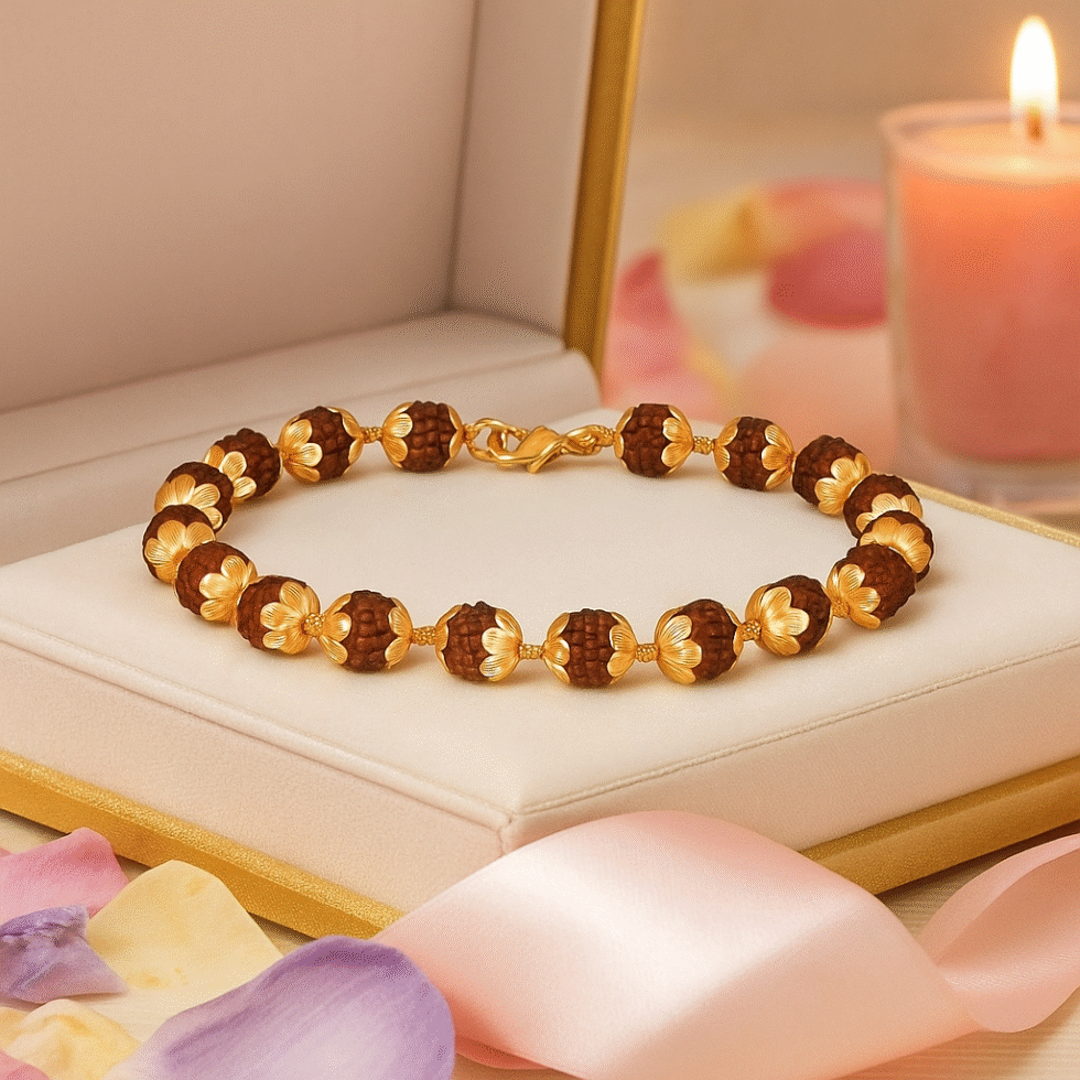 Radiating divine elegance, this Gold-Finish Rudraksha Bracelet blends sacred tradition with timeless style. Each Rudraksha bead is delicately encased in intricately crafted golden lotus caps, symbolizing purity and spiritual awakening. Ideal for meditation, daily protection, or festive gifting, this bracelet enhances positivity, reduces stress, and aligns your aura with higher vibrations. Comes beautifully presented in a luxury gift box—perfect for auspicious occasions or spiritual gifting.